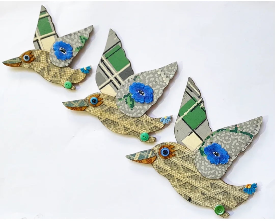 A cute twist on the classic Three Flying Ducks, these Flying Kookaburras will bring the beauty of the Australian bush into your home. Made from reclaimed and recycled vintage linoleum, retro buttons and snippets of pre-loved doilies. Perfect for hanging over the mantle. Large bird approx. 24 x24 cm, medium bird approx. 18x18cm.